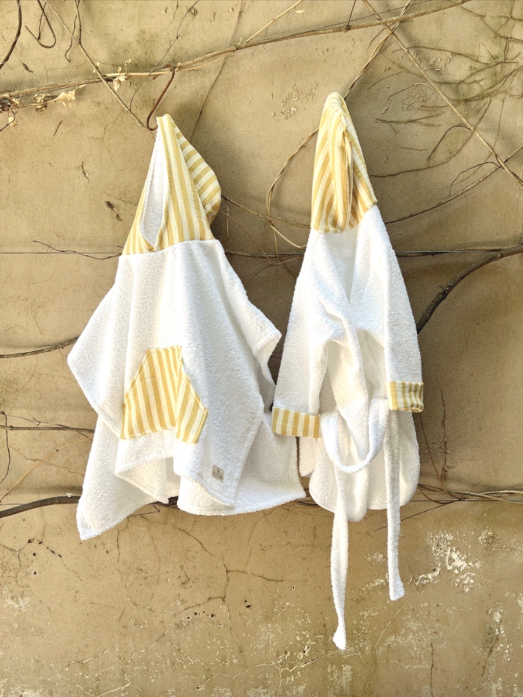 Su capucha y puños están forrados con nido de abeja o tusor de diferentes colores. Posee un lazo para atar. Es tu infaltable a la hora de salir del baño, la playa o la pileta!!