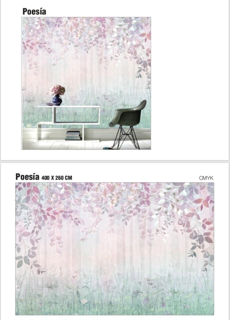 Impresión: revestimiento vinilico texturado mate de 220g procedente de bosques regulados por el FSC con tintas ECO 100% biodegradables, que no liberan COV hacia la atmosfera y son aptas para el uso interior. Resistentes a la luz de facil limpieza con agua y jabon neutro.
